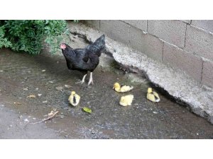 Osmaniye'de kuluçkaya yatan tavuk, yumurtadan çıkan ördek yavrularına annelik yapıyor. İçgüdüsel olarak yüzen ördekleri gören anne tavuğun yavruları suyun içerisinden çıkarmaya çalışması tebessüm ettirdi.