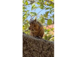 Osmaniye'nin yöresel lezzeti bayram kömbesi yiyen sincabın görüntüsü cep telefonu kamerasına yansıdı.