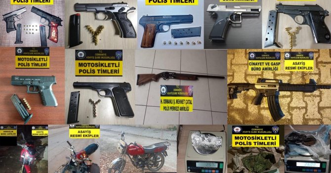 Alınan bilgiye göre, İl Emniyet Müdürlüğü Asayiş Şube Müdürlüğü ekipleri son bir hafta içerisinde şehir genelinde farklı noktalarda oluşturulan uygulamalarda, 134 kişiyi yakaladı. Yapılan aramalarda 2 adet av tüfeği, 7 adet ruhsatsız tabanca, 2 adet kurusıkı tabanca, 42 adet tabanca fişeği, 3 adet çalıntı motosiklet, çeşitli miktarlarda metamfetamin, bonzai ve esrar maddesi ele geçirildi.