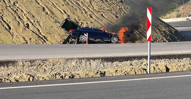 Osmaniye'nin Hasanbeyli ilçesinde direksiyon hakimiyetini kaybetmesi sonucu yol kenarına savrulan otomobil alev alıp yandı, kazada 1 kişi yaralandı.
