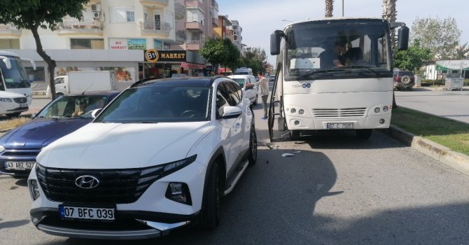 Antalya'nın Manavgat ilçesinde kapısı açık seyreden servis otobüsü, kırmızı ışıkta bekleyen otomobile çarptı. Otobüs kapısı koparken otomobilde hasar oluştu.