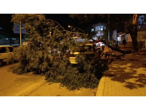 Kahramanmaraş'ta etkili olan fırtına nedeniyle park halindeki otomobilin üzerine ağaç devrildi.