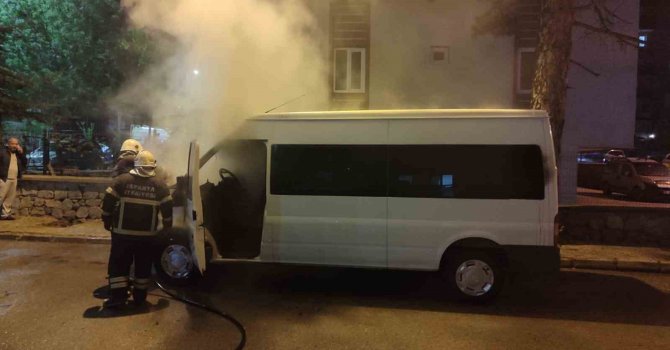 Isparta'da park halindeyken alev alan minibüs, itfaiyenin müdahalesiyle söndürülürken araç kullanılamaz hale geldi.