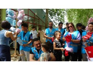 Kozan Ülkü Ocakları tarafından Atatürk Parkında pamuk şeker ve bayraklarla karşılanan çocuklar sevinçle hediyelerini aldı.