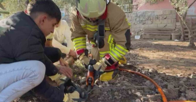 Hatay'da patisi zincire sıkışan köpeğin yardımına itfaiye yetişti.