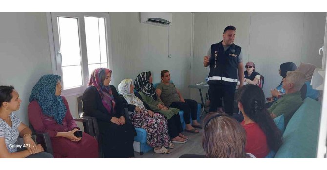 Hatay'da polis konteyner kentte kalan vatandaşları Siber Suçlar, Bilişim, Uyuşturucu ile mücadele konusu ve UYUMA uygulaması hakkında bilgilendirdi.