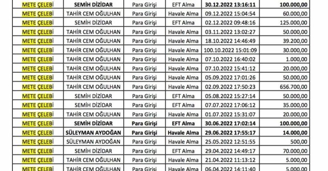 İddiaya göre, Zeydan Karalar'ın başkanlığı döneminde Adana Büyükşehir Belediyesi'nin reklam ihale işlerinin neredeyse tamamını kazanan bu firmalar, daha önce şartnameyi kendilerine sızdıran ve şu an CHP Adana İl 2'nci Başkanlığı koltuğunda oturan Mete Çelebi'nin banka hesaplarına 1 milyon 823 bin TL rüşvet yatırdı. Mete Çelebi'nin aynı zamanda CHP Genel Başkanı Özgür Özel'in Adana'ya her gelişinde satranç oynadıkları fotoğraf da ortaya çıktı.