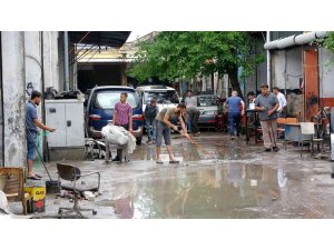 Osmaniye'de dün akşam saatlerinde etkili olan kuvvetli sağanak yağışında iş yerlerini su basan Küçük Sanayi Sitesi esnafları iş yerlerini temizleyerek güne başladı.