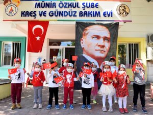 Muratpaşa Belediyesi’nin hastanelerin covid-19 pandemi servisi ve laboratuvarlarında görev yapan sağlık çalışanlarının 3-6 yaş arası çocukları için açtığı Münir Özkul Kreş ve Gündüz Bakım Evi’nin küçük öğrencileri, 23 Nisan Ulusal Egemenlik ve Çocuk Bayramı’nı kutladı. Çocuklar, bayram için Atatürk fotoğraflarından yapılmış taçlar taktı, Türk bayraklı tişörtler giydi. Ellerinde Türk bayraklarıyla 23 Nisan için özel hazırlanan pano önünde şiirler okuyan çocuklar, kreş bahçesinde de günlerdir büyük bir heyecanla hazırlandıkları gösterilerini sundu. Çocukların, gösteriler sırasında sosyal mesafelerini korumaları için hulahopların kullanılması dikkat çekti. Haber Merkezi
