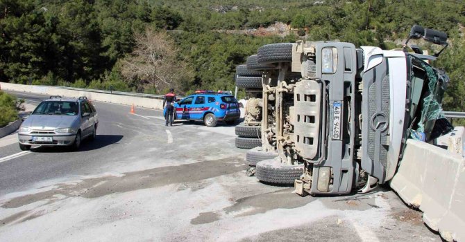 Muğla'nın Sakartepe rampasından iniş yapan kum yüklü kamyon virajı alamayınca yan devrilmesi sonucu ulaşım bir süre durdu.