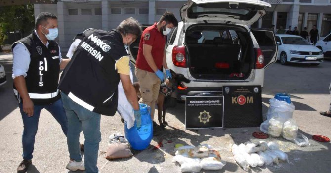 Mersin'de şüphe üzerine durdurulan bir araçta narkotik köpeği "Brego" vasıtasıyla yapılan aramada, salça ve peynir bidonları arasına gizlenmiş 7 kilo 580 gram esrar ele geçirildi.