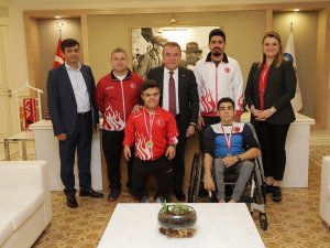 Antalya Büyükşehir Belediyesi ASAT Gençlik ve Spor Kulübü’nün Bedensel Engelli Halter Şampiyonları Serkan Çakmaz ve İsmail Korkmaz, Antrenörleri Mustafa Otum ve Ekrem Celil'le birlikte Başkan Muhittin Böcek’i ziyaret etti. 54 kiloda 2019 Türkiye Şampiyonu Serkan Çakmaz, 49 kiloda 2018 Türkiye Şampiyonu İsmail Zeki Korkmaz’ı kabul eden Başkan Böcek, engelli sporcuları başarılarından dolayı kutlayarak saat hediye etti.