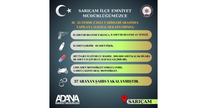 Adana Emniyet Müdürlüğü, Sarıçam İlçe Emniyet Müdürlüğünce 18-25 Temmuz tarihleri arasında yapılan asayiş uygulamaları sonucunda 12 ruhsatsız tabanca, 6 av tüfeği ve bu silahlara bağlı 12 şarjör, 46 fişek ele geçirildi. Aynı zamanda yapılan çalışmalar sonucunda 287,73 gram uyuşturucu madde, 200 bin kaçak sigara, 66 uyuşturucu hap ele geçirildi. Trafik denetleme ekiplerince yapılan sorgulamalar sonucunda bin 105 motosiklet sorgulandı, 1 çalıntı motosiklet ele geçirildi.
