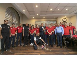 Büyükşehir Belediyesi Genel Sekreteri Olcay Tok, İtfaiye Daire Başkanı Mehmet Bahtiyar Aydın ve personellerin yer aldığı ziyarete, Büyükşehir Belediyesinin iz takip köpeği Belçika malinois kurdu "Ares" ve okullarda düzenlenen sosyal projelerde öğrencilerde sempati oluşturan Toy Poodle cinsi "Brad" de getirildi.