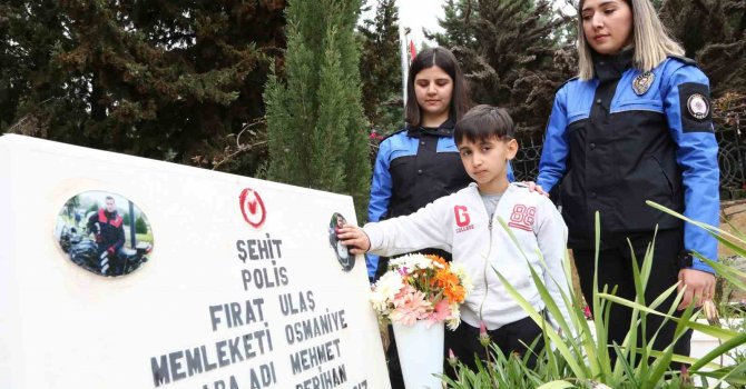 Adana'da 6 yıl önce şehit düşen polis memurunun 9 yaşındaki oğlu Mehmet Efe Ulaş, "Polis Haftası'nda babasını unutmadı. Babasının silah arkadaşlarıyla mezara giden Mehmet Efe'nin, şehit babasının fotoğraflarını okşayıp dua okuması yürekleri dağladı.