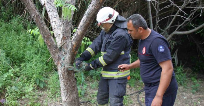 Serik'te bir evin bahçesinde balık ağlarına dolanan yılanı, itfaiye ekipleri bulunduğu yerden kurtararak doğal ortamına saldı.