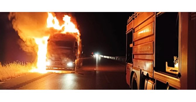 Hatay'da seyir halindeyken yanmaya başlayan tır alevlere teslim oldu.