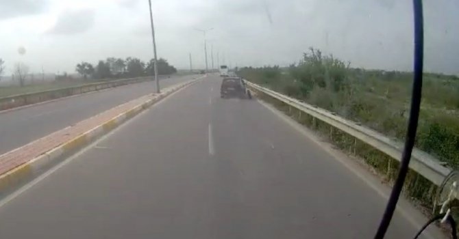 Antalya'nın Serik ilçesinde seyir halindeki Tofaş Kartal marka otomobilin tekeri çıktı. Sürücünün aracın yoldan çıkmaması için yaptığı mücadele anbean araç kamarası tarafından kaydedildi.