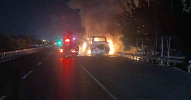 Antalya'nın Manavgat ilçesinde seyir halindeki tur otobüsü alev alev yandı. Yangının otobüsün orta bölümünden başladığı, büyük ihtimalle su ısıtıcısından çıktığı tahmin edilirken, yolcu bulunmayan otobüs tamamen yanarak kullanılamaz hale geldi.