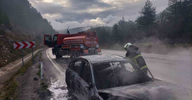 Burdur'un Bucak ilçesinde seyir halindeyken araçta çıkan yangın itfaiye ekipleri tarafından söndürülürken araç kullanılmaz hale geldi.
