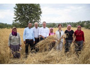 Konuşmaların ardından Başkan Seçer eşi Meral Seçer ile birlikte buğday hasadı yaptı ve üreticilerin buğdaydan elde ettikleri unla yaptıkları sıkmanın tadına baktı.