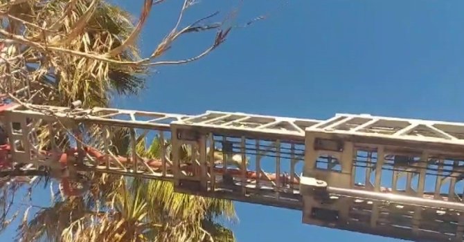 Mersin'in Silifke ilçesinde günlerdir bir palmiye ağacının tepesinde mahsur kalan sokak kedisi, duyarlı vatandaşların ihbarı üzerine itfaiye ekiplerince kurtarıldı. Kedinin, uzatılan merdivenden korkmadan ve sakin bir şekilde aşağı inmesi yüzlerde tebessüm oluşturdu.