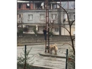 Korku ve panik yaşayan çocuk, direğin başında köpekleri ayaklarıyla kovalamaya çalıştı.