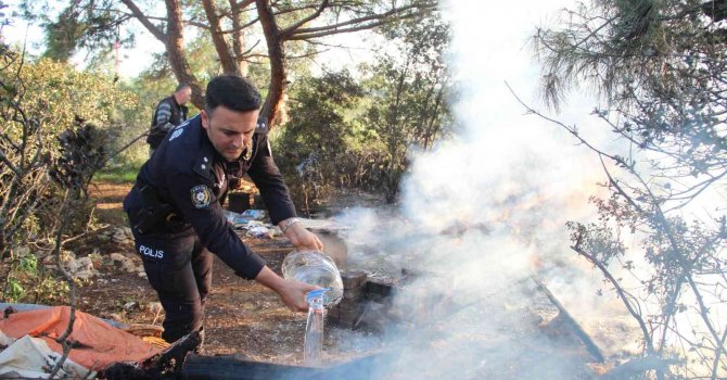Antalya'nın Konyaaltı ilçesinde ormanlık alanda yanan baraka, ekipleri harekete geçirdi. Polis ve bir vatandaş, alevlerin ormana sıçramaması için su dolu bidonlarla yangına müdahalede bulundu.