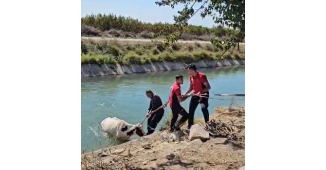 Mersin'in Tarsus ilçesinde sulama kanalına düşen inek, Mersin Büyükşehir Belediyesi itfaiye ekipleri tarafından kurtarıldı.