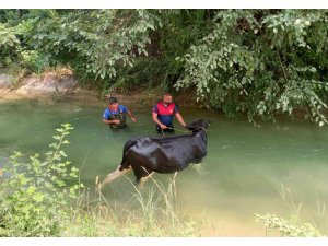 Osmaniye'nin Kadirli ilçesinde otlanırken dengesini kaybederek sulama kanalına düşen inek itfaiye ekiplerince kurtarıldı.