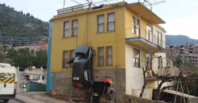 Alanya Sugözü Mahallesi Kütürüp mevkisinde yaşayan 47 yaşındaki Mehmet Aydın, otomobiliyle geçtiğimiz gün kazaya karıştı. Aydın, ardından otomobilini evinin önünde dört gün bekletti. Ayan, daha sonra vinç yardımıyla iki katlı müstakil evinin çatısından halatla ile aracını binanın dışına astı. Yaklaşık bir ton ağırlığındaki 32 yaşındaki otomobili duvarda asılı görenler ise büyük şaşkınlık yaşadı. Evin duvarında adeta şaha kalkmış şekildeki otomobilin görüntüsü mahalle halkını da şoke etti. Görenleri hayrete düşürecek şekilde duran otomobilinin kazaya karışmadığını iddia eden Aydın, başka araçlara ve duvarlara çarpması sebebiyle otomobilini iple bağlama şeklinde bir ceza verdiğini söyledi.
