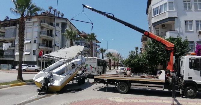 Antalya'nın Manavgat ilçesinde minibüsün arkasındaki römorkunun üzerindeki tekne, mekanizmasının boşa çıkması sonucu yola düştü. Teknenin düşmesi nedeniyle araç trafiğine kapatılan yol, çekicinin gelerek tekneyi yeniden römorkun üzerine alması sonucu açıldı.