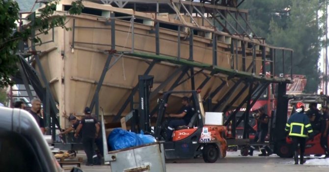 Dün saat 17.00 sıralarında Konyaaltı ilçesi Serbest Bölge'de faaliyet gösteren bir tersanede çıkan ve içerisinde tekne yapımında kullanılan kimyasal malzemelerin de yanmasıyla güçlükle söndürülen yangında, yeni görüntüler ortaya çıktı. Havadan, karadan 3 saatlik müdahaleyle kontrol altına alınabilen yangında tersane içerisindeki yapımı devam eden lüks bir yat, yat iskeletindeki tekerlekli sistem ve fabrika çalışanlarının forklift desteğiyle alevlerden uzaklaştırıldı. Yine söndürme çalışmaları devam ederken, yanan fabrikanın yakınında da yapımı biten lüks teknelerin yer aldığı görüldü.