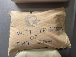 THY'nin TK1357 sefer sayılı İstanbul-Madrid uçağında, deprem bölgelerine yardım için gelen ve ülkelerine dönen İspanyol arama kurtarma ekibi de yer aldı. Uçaktaki kokpit ve kabin ekibi, teşekkür amacıyla yastığın bir yüzüne ay-yıldız çizip "With the gratitude of Cabin Crew" yazdı. Diğer yüzüne ise kabin ve kokpit ekibinin isimleri yazılıp bröveleri takılarak, İspanyol arama-kurtarma ekibine hediye edildi. İspanyol arama kurtarma görevlileri, kabin ekibinin jesti karşısında duygu dolu anlar yaşadı.