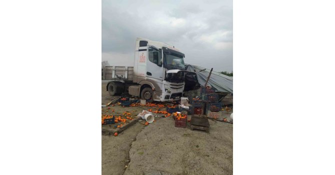 Hatay'ın Erzin ilçesinde tır yol kenarındaki portakal tezgahına daldı kazada 1 kişi yaralandı.