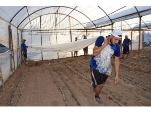 Kumlucalı çiftçiler, örtü altı sebze üretim sezonunun son bulmasıyla birlikte solarizasyon çalışmaları yapıyorlar. Yaklaşık 50 derece olan sera içi sıcaklığına katkı sağlamak için toprak üstüne seranın üzerindeki plastik örtünün daha ince bir plastik örtü daha seriyorlar.