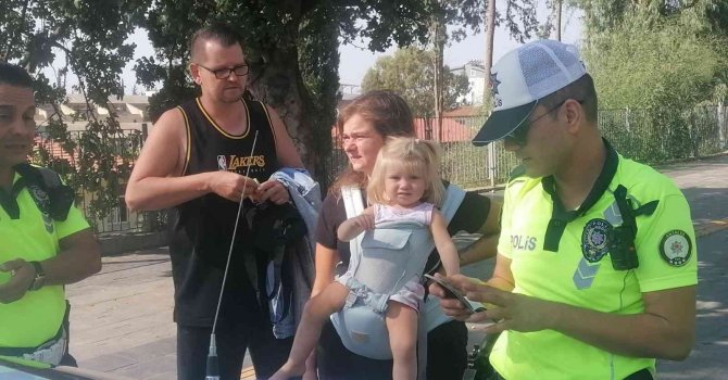 Manavgat'ta 5 yıldızlı bir otelde tatil yaptıkları öğrenilen ve kiraladıkları motosikletle Manavgat ilçe merkezine gelirken trafik denetimine takılan Alman çiftten motosikleti kullanan erkeğin kask olmasına rağmen takmadığı, yolcunun ise kask taktığı gözlendi. Motosiklet sürücüsüne kask takmamaktan 192 TL para cezası uygulandı.