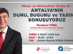 Antalya Büyükşehir Belediye Başkanı Menderes Türel, Mimar ve Mühendisler Grubu Antalya İl Temsilciliği’nin katılacağı toplantıda “Antalya’nın Dünü, Bugünü ve Yarınını” konuşacak.