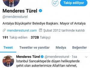 İstanbul Sancaktepe’de dün eğitim uçuşu yapan bir askeri helikopter düştü. Kazada 4 asker şehit olmuştu. Antalya Büyükşehir Belediye Başkanı Menderes Türel sosyal medya aracılığı ile şehit olan askerlerin ailelerine başsağlığı diledi. Türel, “İstanbul Sancaktepe'de düşen helikopterde şehit olan askerlerimize Allah'tan rahmet, yakınlarına sabır, yaralı askerlerimize acil şifalar dilerim. Milletimizin başı sağolsun” dedi. Mahsum ALTAŞ