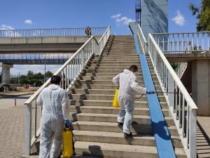 Antalya Büyükşehir Belediyesi’nin yeni normal hayatın başlamasıyla beraber salgına karşı halk sağlığını korumak adına çalışmalarına devam ediyor. Büyükşehir Belediyesi Çevre Koruma Dairesi Başkanlığı ekipleri vatandaşın yoğun kullandığı alanlarda ilaçlama çalışması yapıyor. Kent merkezinde bulunan yürüyen merdivenli üst geçitler ve asansörler dezenfekte edildi. Büyükşehir Belediyesi yetkilileri vatandaşları maske kullanımı ve sosyal mesafeye dikkat etmesi gerektiği konusunda uyarı yaptı.  Haber Merkezi