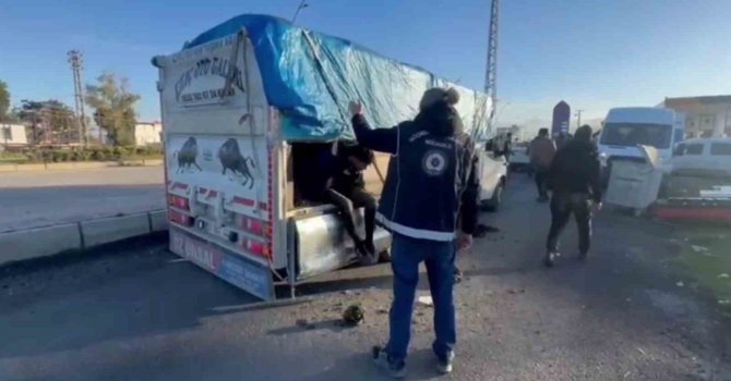 Hatay'da polis ekipleri tarafından gerçekleştirilen operasyonda; üstü hayvan gübresiyle kamufle edilen kamyonetin gizli bölmesinden 19 yabancı uyruklu göçmen yakalandı.