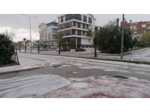 Antalya'nın Manavgat ilçesinde etkili olan dolu yağışı ilçeyi beyaz örtüyle kapladı. Çocuklar, oyun parklarında doludan top yapıp kar gibi oynadı.