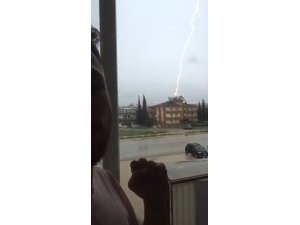 Hatay'ın Antakya ilçesinde bir gencin, sağanak yağmuru ve şimşekleri videoya çektiği anlarda bir binanın üzerine yıldırım düştü.