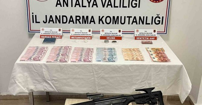 Antalya'nın Manavgat ilçesinde jandarma ekipleri tarafından bir adrese yapılan operasyonda 19 gram metamfetamin, 17 adet klozette atılmış uyuşturucu hap ve 4 gram skunk ele geçirildi.