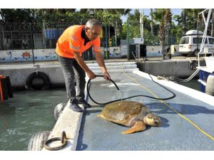 Mersin Büyükşehir Belediyesi Çevre Koruma ve Kontrol Dairesi'ne bağlı ekiplerin, liman içerisinde yaptıkları temizlik esnasında karşılaştıkları yüzemeyen ve dalamayan vaziyette buldukları caretta caretta, ekipler tarafından kurtarılarak Deniz Kaplumbağası Hastanesi yetkililerine teslim edildi.