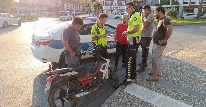 Kaza, Manavgat'ın Örnek Mahallesi Zübeyde Hanım Caddesi üzerinde meydana geldi. Trafik ışıklarında bekledikten sonra orta şeritten Barbaros Caddesine dönmeye çalışan Mehmet Yaykıç'ın kullandığı 07 ART 504 plakalı motosiklete, Barış Özkan'ın kullandığı 07 BIJ 622 plakalı otomobil çarptı. Kazanın ardından çevrede ki vatandaşların ihbarı üzerine olay yerine ambulans ve trafik ekibi sevk edilirken kazada ayağından yaralanan motosiklet sürücüsü olay yerine gelen sağlık ekibinin tedavi için hastaneye gitme talebini kabul etmeyerek ambulansa binmedi. Manavgat Emniyet Müdürlüğü Trafik Denetleme Büro Amirliği ekiplerince yapılan kontrolde muayenesinin olmadığı belirlenen motosikletin sahibine bin 506 TL para cezası uygulandı.
