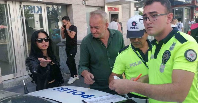 Antalya'nın Manavgat ilçesinde trafik denetiminde kask takmadığı için ceza uygulanan elektrikli bisiklet sürücüsü kadın, kask takmak zorunda olmadığını belirterek kameraya dönüp, "Bunlar artistlik yapıyor" dedi. Cezanın yanlış yazıldığını söyleyip geri gelen kadının elektrikli bisikleti bu kez eksik evraktan bağlandı.