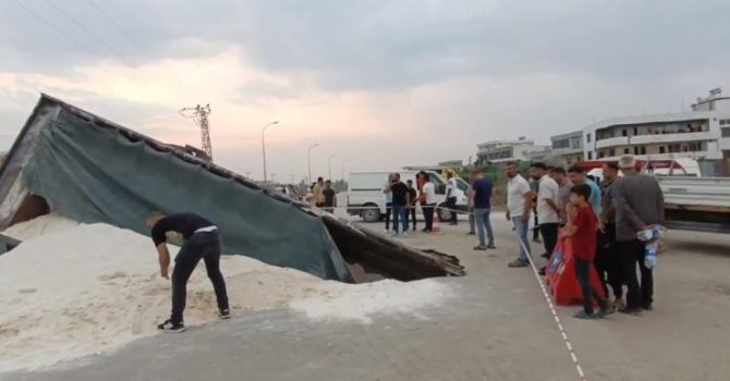 Adana'da kum yüklü kamyon, yolun çökmesi ile oluşan çukura düştü. Kumlar yola saçılırken, araç düştüğü yerden saatler süren çalışma sonrası çıkarıldı.