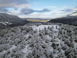 Burdur'un 1238 rakıma sahip Altınyayla ilçesi kar yağışının ardından beyaz örtüyle kaplandı. Yeşil ağaçların kar beyaz ile bütünleşmesi ise doğaseverler tarafından drone ile kayda alındı. Eşsiz manzara ise görenleri kendine hayran bıraktırdı.