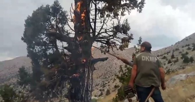 Doğa Koruma ve Milli Parklar görevlilerinden Metin Yıldız, "Arabayla buraya gelinmesi imkansız. Burada yerler tamamen kuru. Biz 3 kilometre aracı geriye bıraktık ve tepelerden geldik. İyi ki bu bölgeye kadar geldik. Çok büyük bir felaketi önlemiş olduk. Ağacın gövdesi çok kalın. Sabaha kadar beklesek ağaç yanıp bitmez. Ağacı yatırıp müdahale edeceğiz" dedi.